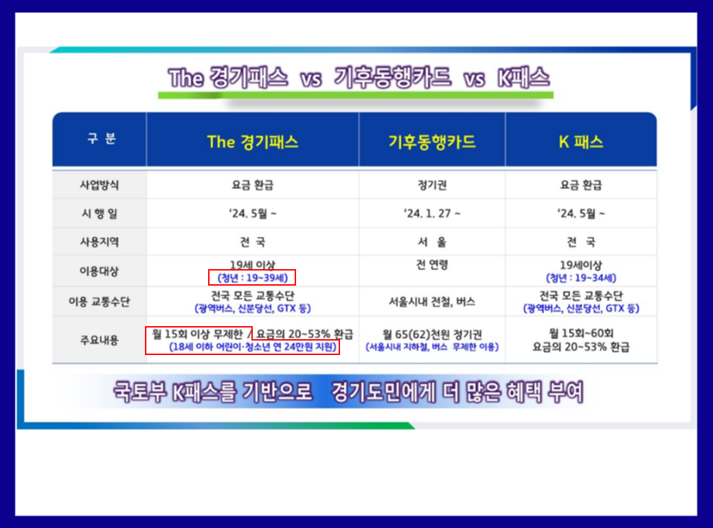 ※ K-패스 가입자 중, 주소지가 경기도인 분들은 자동으로 The 경기패스 대상자로 확인 및 적용 : 경기패스의 혜택 2가지가 자동으로 추가됩니다! ▶ 월 15회 이상 무제한 + 청년층 환급 연령 확대 : 19~34세 → 19세 ~ 39세 ![]() |